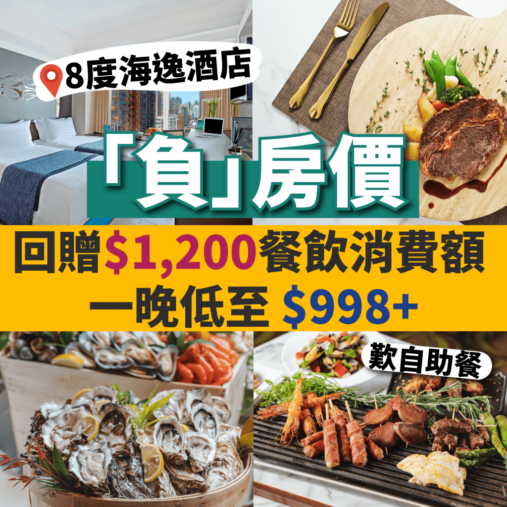 【8度海逸酒店Harbour Plaza 8 Degrees「負房價」震撼優惠】激抵呀!入住一晚$998起,回贈$1,200餐飲消費額!歎自助餐/12週年尊尚晚市套餐!