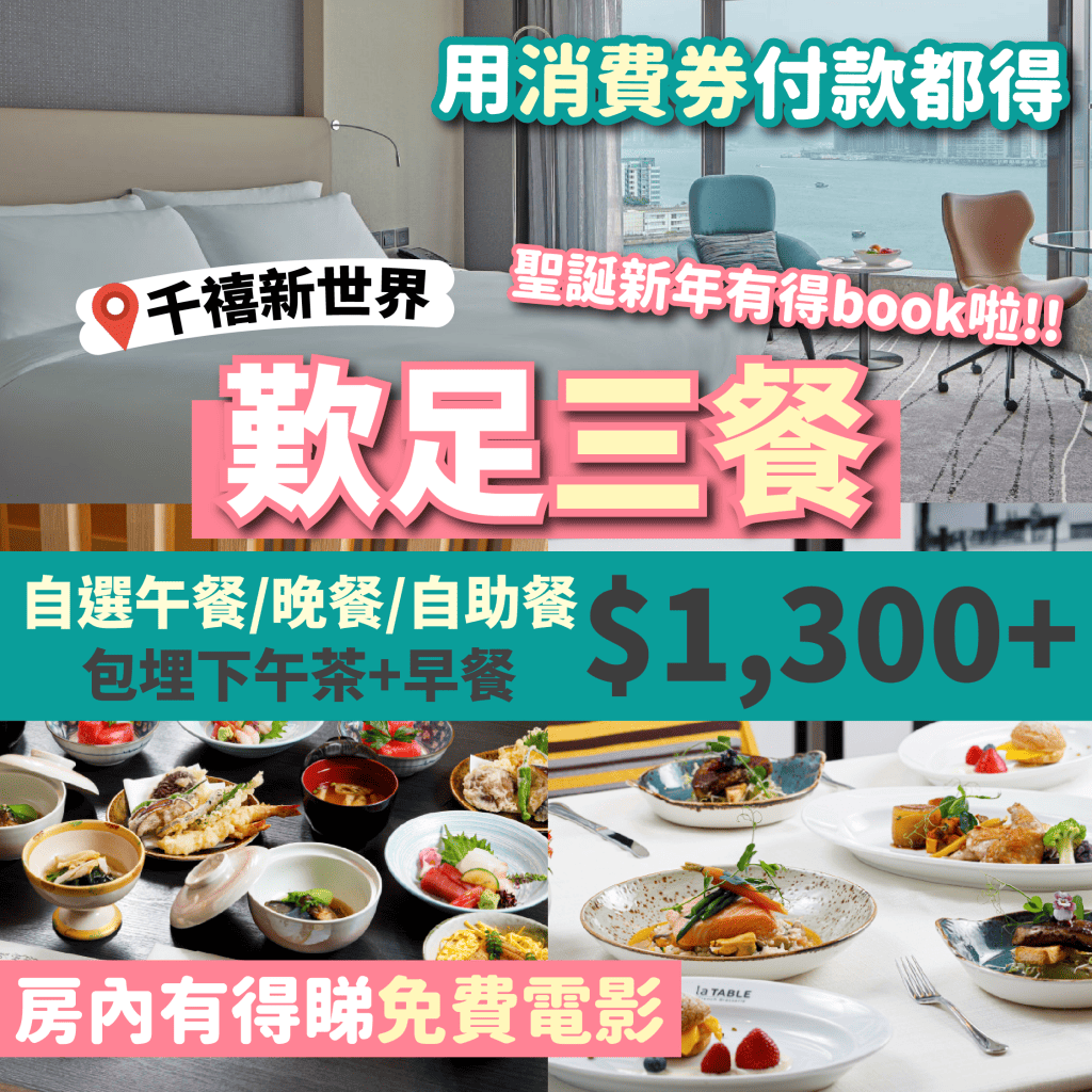 【千禧新世界香港酒店食足三餐優惠】抵!雙人自選午餐/晚餐+下午茶+自助早餐,一晚$1,300起!餐飲總值超過2千!平日高達26小時住宿!用埋消費券,抵上加抵!