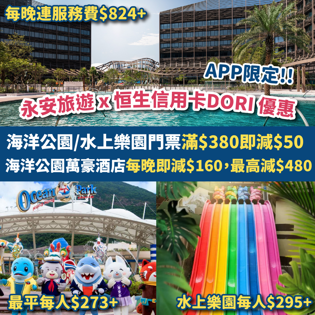 【永安旅遊 x 恒生信用卡DORI 優惠】抵抵抵!海洋公園/水上樂園門票滿$380即減$50!海洋公園水上樂園門票$295起!海洋公園萬豪酒店每晚即減$160,入住一晚連服務費$824起!