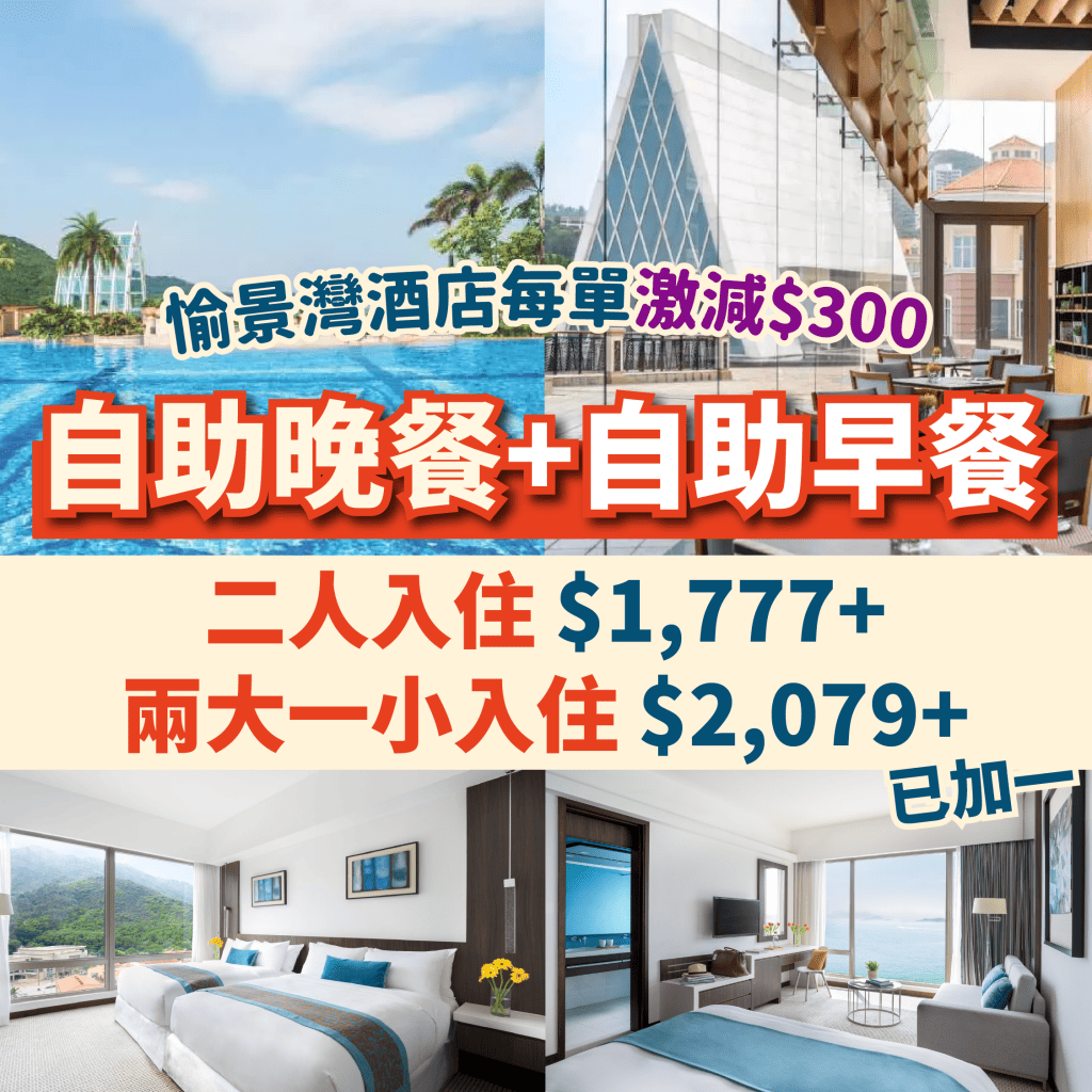 【愉景灣酒店爆賞星期三優惠】激激激抵!每單即減$300!包自助晚餐+自助早餐,一晚連服務費$1,777起!兩大一小$2,079起!首200間獨家送玫瑰香薰1枝!