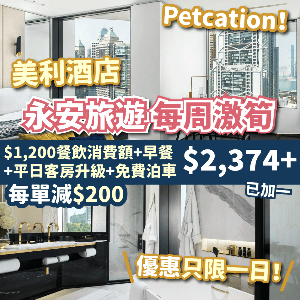 永安旅遊每週激筍第一擊有美利酒店嘅激筍優惠!抵!每單即減$200!$1,200餐飲消費額+雙人早餐+平日保證客房升級+免費泊車,一晚連服務費$2,374起!留意返,優惠只係做10月18日今日一日咋,想帶埋毛孩Staycation就記得mark定時間book房啦!