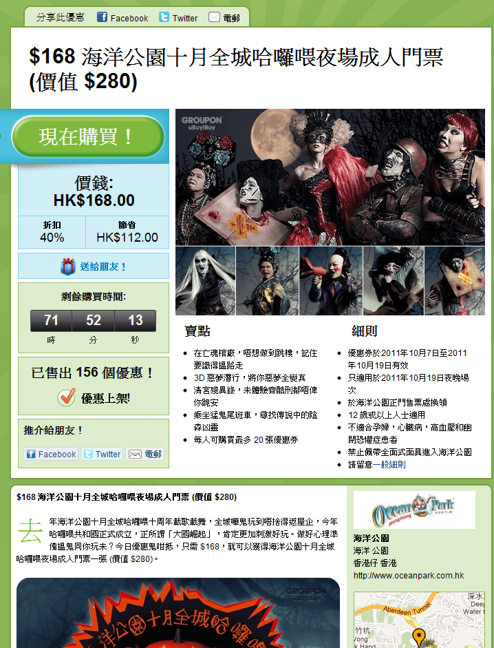 Groupon HK X 海洋公園決定係2011年10月18日加推以$168換購原價$280海洋公園十月全城哈囉喂夜場