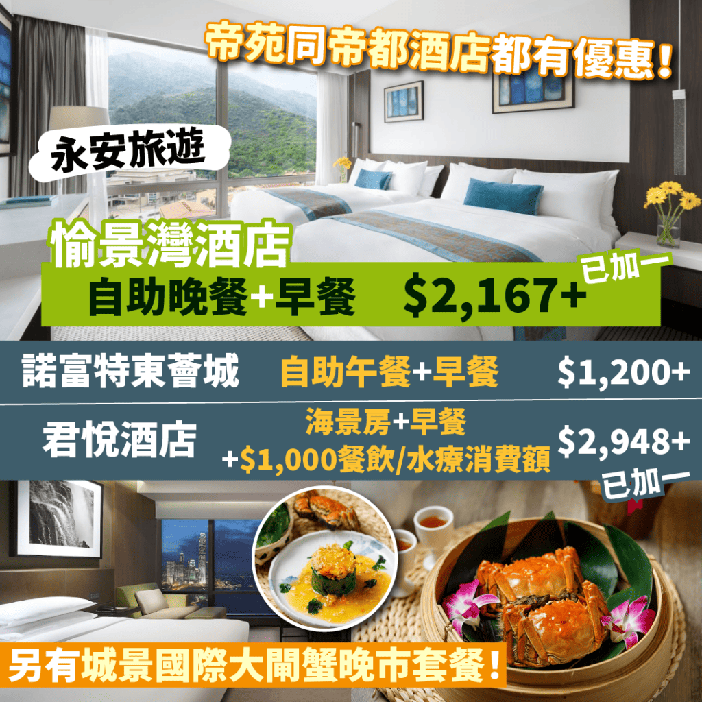 【永安旅遊 預訂攻略】愉景灣酒店自助晚餐+早餐,一晚連服務費$2,167起!君悅住海景房+早餐+$1,000餐飲/水療消費額,一晚連服務費$2,948起!