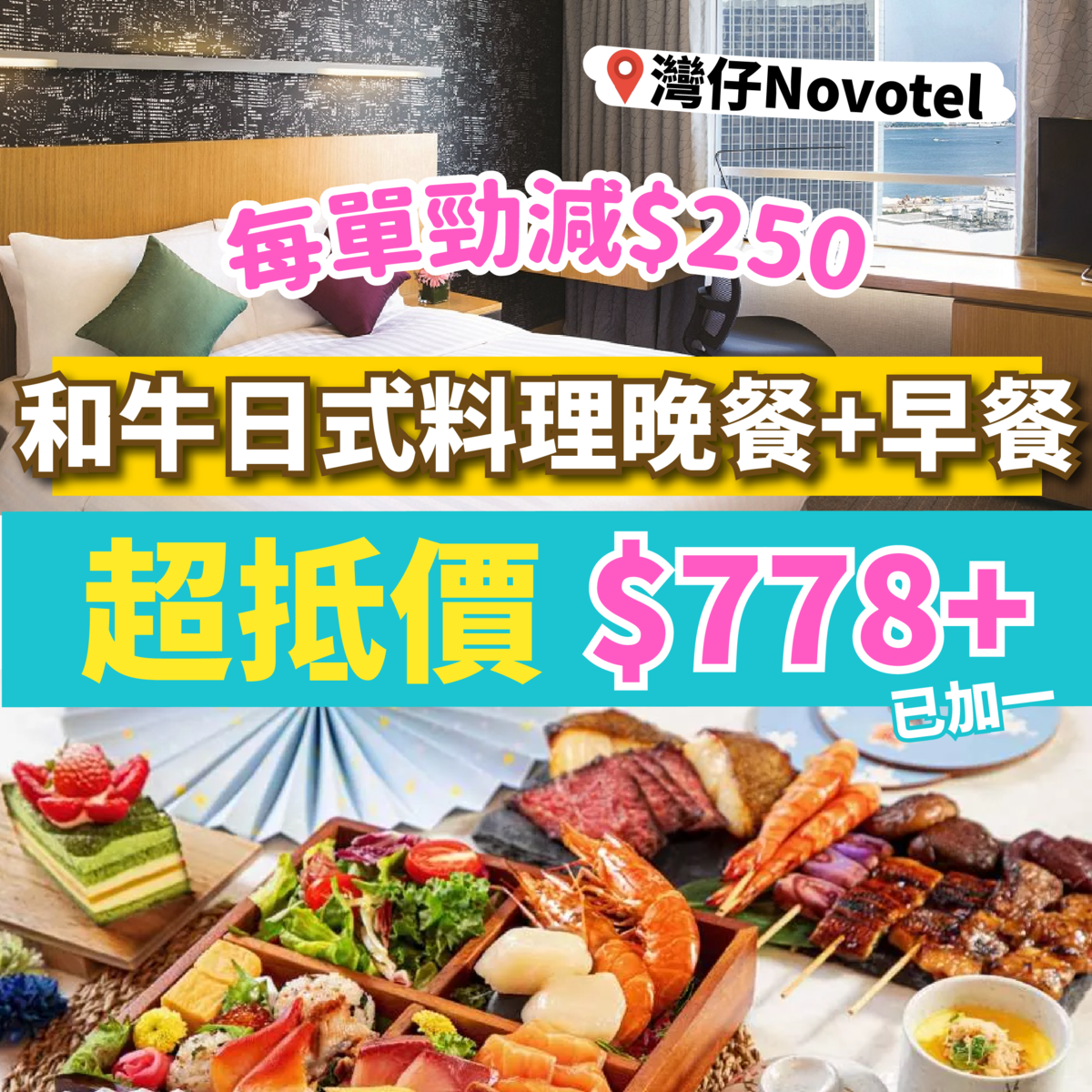 【永安旅遊雙11瘋狂大激減】一泊二食!爆抵住!和牛日式料理晚餐+早餐,入住一晚連服務費只需$778起(平均每人$389起)!灣仔諾富特世紀酒店每單勁減$250!