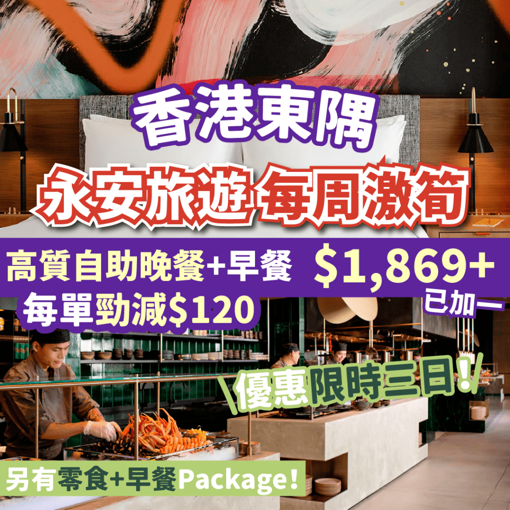 【永安旅遊每周激筍】限時三日!EAST Hong Kong大受好評自助晚餐+早餐+歡迎零食,一晚連服務費$1,869起!香港東隅每單減$120!