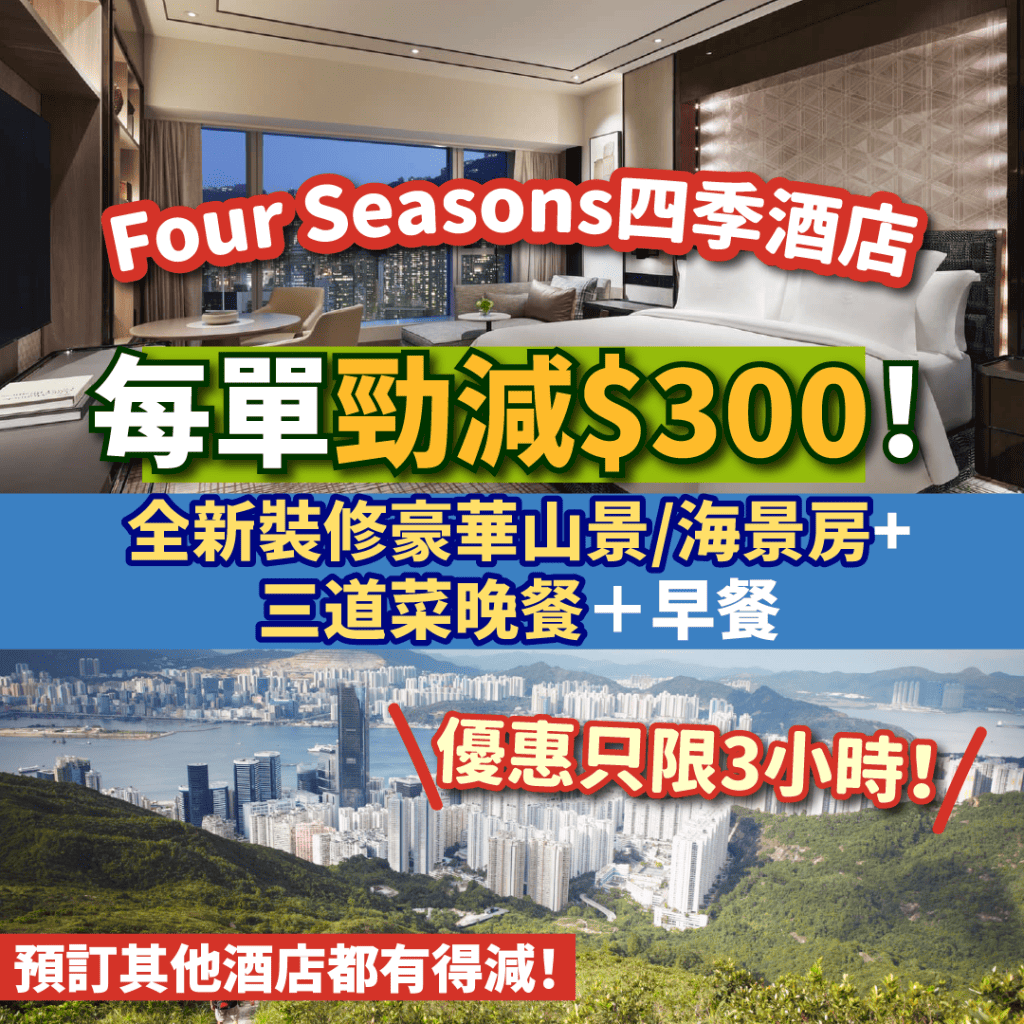 爆賞星期三返嚟啦!今期永安旅遊爆賞星期三優惠到五星級四季酒店(Four Seasons)啦,用推廣碼:DC990,每單勁減$300!於The Lounge/房內享用精緻三道菜晚餐+酒店早餐+住全新裝修豪華山景/海景房!今次優惠限時3小時咋,大家mark實時間搶啦!
