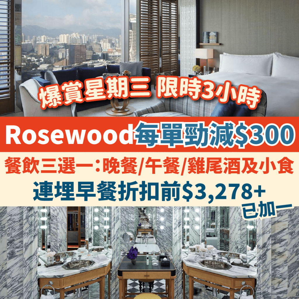 【永安旅遊 爆賞星期三】激抵!限時3個鐘!Rosewood套票每單勁減$300!餐飲三選一:晚餐/午餐/雞尾酒及小食,連埋早餐一晚連服務費折扣前$3,278起!