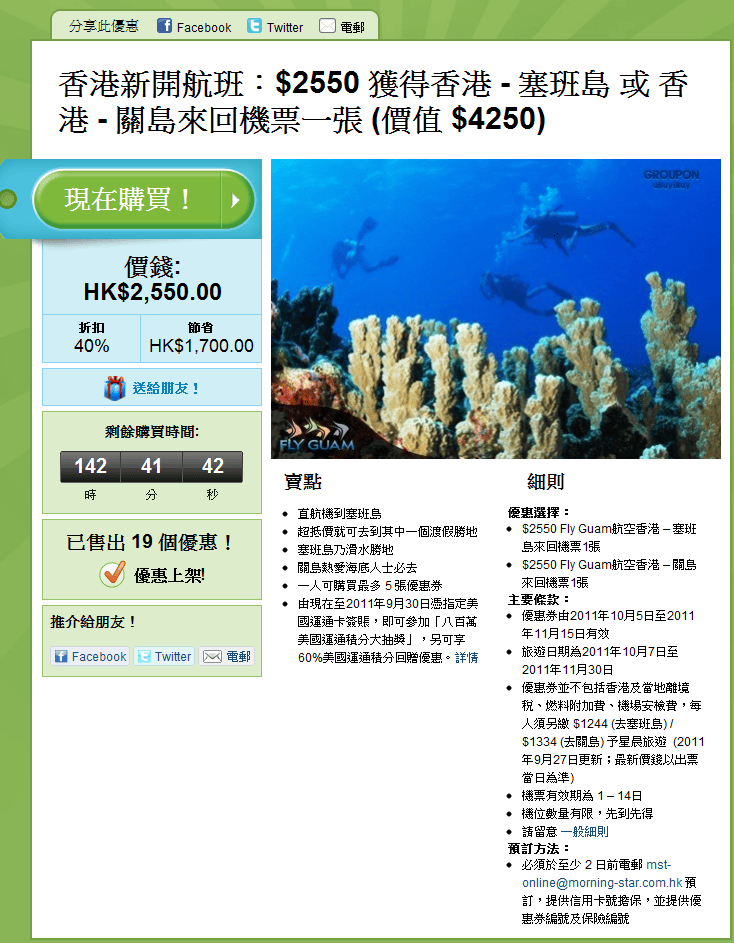 Groupon 呢個全球最大既團購網站,香港分站而家連機票都有得賣