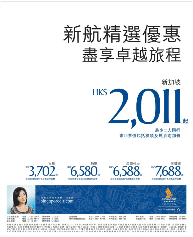 新加坡航空今日推出左一個香港至新加坡二人同行既機票優惠