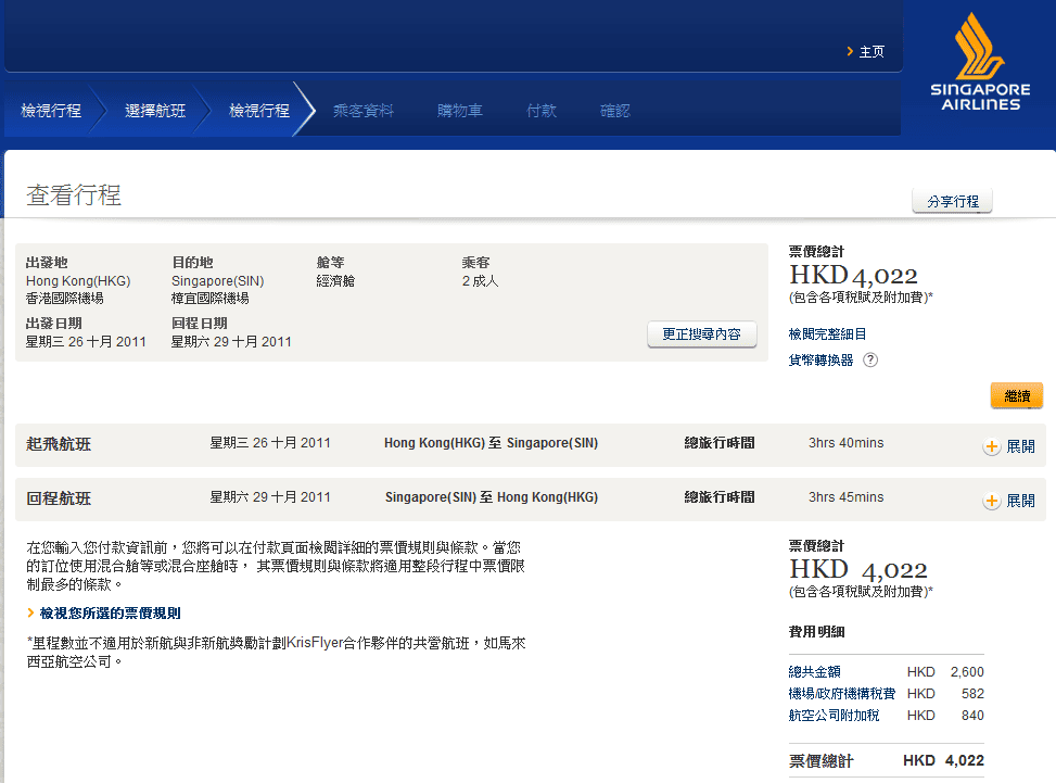 香港至新加坡二人同行來回票價包稅每人只需$2,011起 – 新加坡航空 (至10日30日)