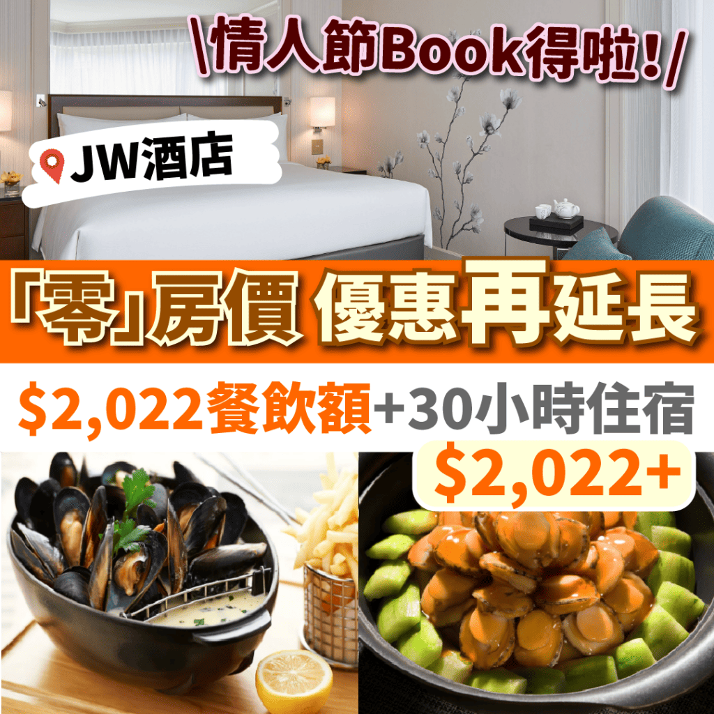 【香港JW萬豪酒店JW Marriott優惠】JW「零」房價 再再再延長!住足30小時住宿,一晚$2,022起!回贈$2,022餐飲額!可用於酒店餐廳/房內用餐!