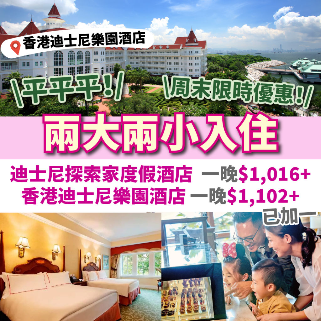 【香港迪士尼樂園酒店Hong Kong Disneyland Hotel優惠】平平平!限時優惠!兩大兩小入住迪士尼探索家一晚連服務費$1,016起、樂園酒店一晚連服務費$1,102起!用App優惠代碼預訂可以再平多$100!