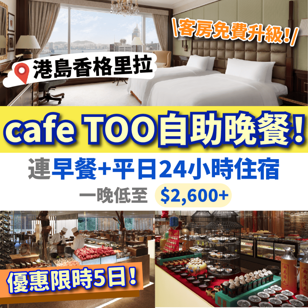 【港島香格里拉自助晚餐度假住宿限時優惠】抵呀!雙人cafe TOO自助晚餐+早餐,一晚$2,600起!客房免費升級+平日24小時住宿!