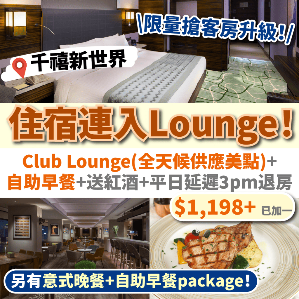 【千禧新世界香港酒店優惠】住宿連入Lounge!自助早餐+Club Lounge(全天候供應美點)+送紅酒,一晚連服務費$1,198起!限量搶客房升級!另有意式晚餐+自助早餐package!