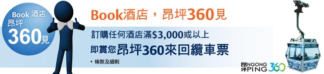 於ZUJI 訂購酒店滿$3,000 將可獲得昂坪360 來回纜車票兩套 價值$230 (至12月31日)