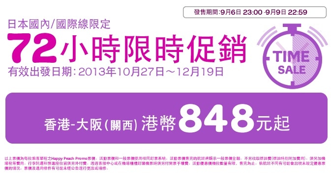 今日中午樂桃航空先開賣新增既香港至大阪航班,岩岩樂桃宣佈將會係今晚11點(9月6日)推出限時72小時優惠