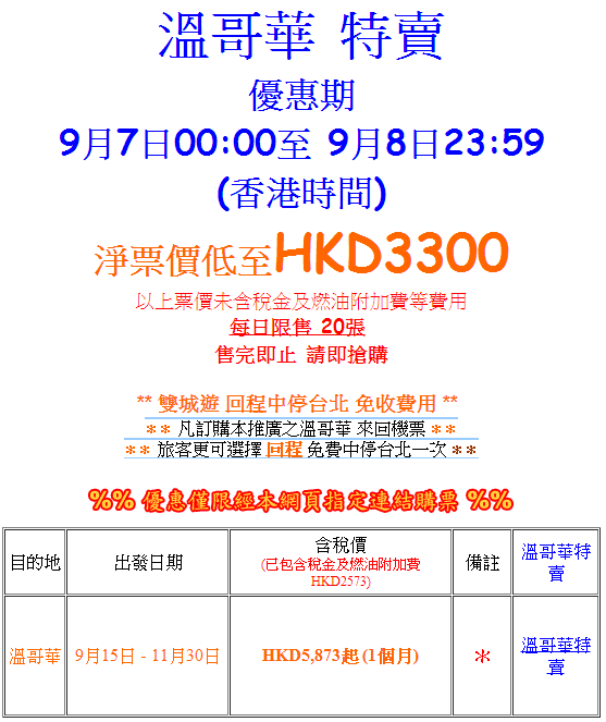 詳情:http://www.china-airlines.com/hk/promotionhk/promotionhk000611.htm