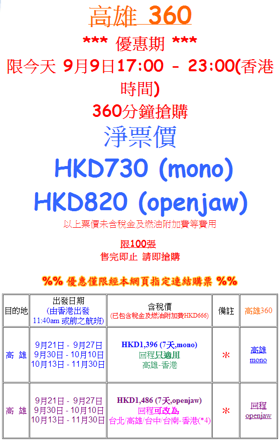 香港往返高雄只需$730,連稅$1,396。如果回程由台北/台中/台南返既話,只需$820,連稅$1,486