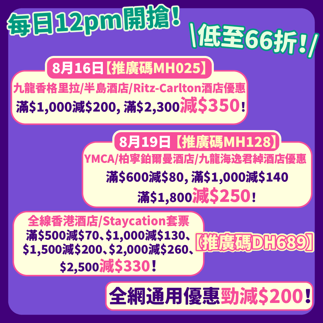 想staycation可以留意今日中午12時半島/九龍香格里拉/Ritz-Carlton滿$1,000減$150,滿$2,300勁減$350【推廣碼MH025】!仲有8月19日嘅YMCA/柏寧鉑爾曼酒店/九龍海逸君綽滿$600減$80,滿$1,000減$140,滿$1,800勁減$250【推廣碼MH