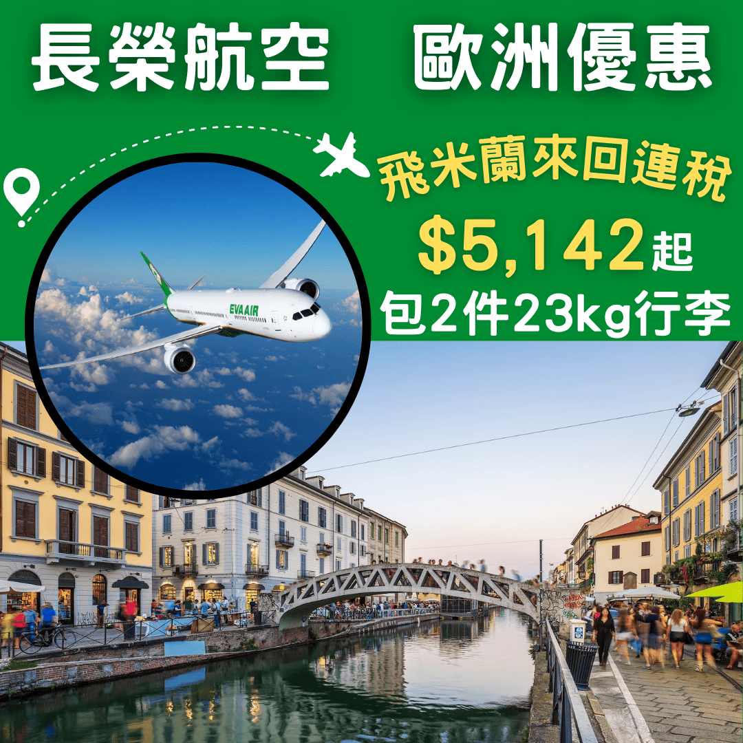 長榮飛米蘭優惠!連稅5千1!12月31日前出發!包2件23kg行李!香港飛米蘭來回連稅只需$5,142起 – 長榮航空