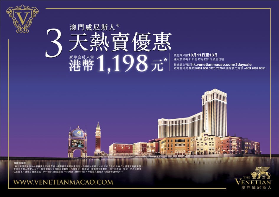 澳門威尼斯人 3 天熱賣優惠正式開始! 我們特意為您獻上豪華套房每晚港幣 1,198元*之驚喜優惠, 適用於預定 10 月11 日至 12 月22 日。 您更可選擇以相同價格入住澳門金沙酒店。優惠由即日起至 10 月 13 日(星期四)下午 6 時止