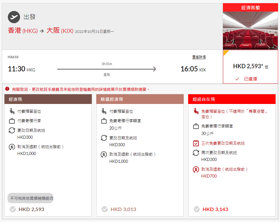 ***update 10/10 9am: 剛剛再check,香港航空已經收起曬所有平飛,全部加曬價到$4,443***