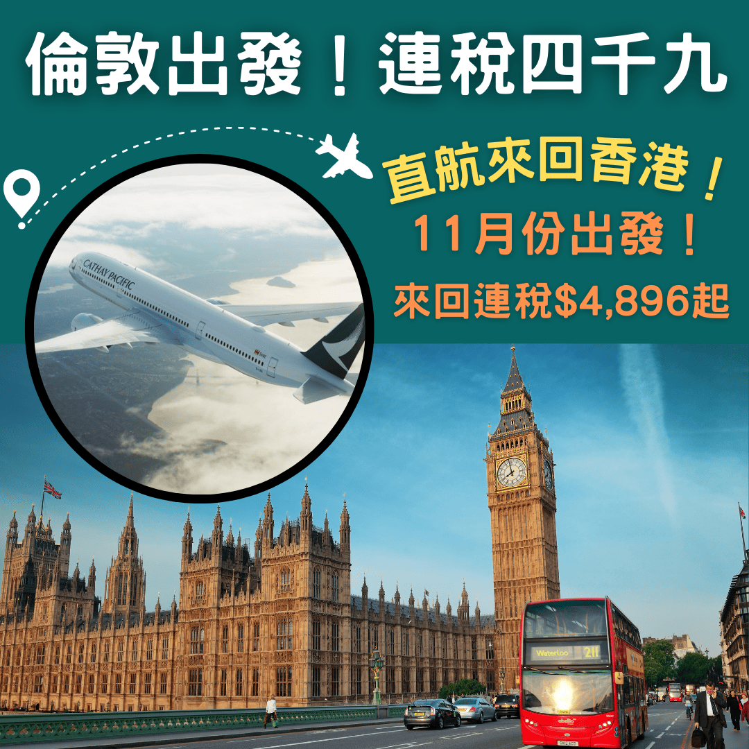 倫敦出發!連稅四千九!直航來回香港!11月份出發!倫敦直航返港來回連稅只需$4,896起 – 國泰航空 (優惠至10月18日)