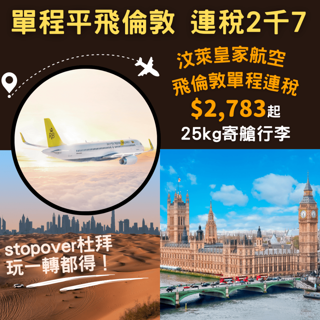 單程平飛倫敦!連稅2千7!25kg寄艙行李!可stopover杜拜玩一玩!香港飛倫敦單程連稅只需$2,783起 – 汶萊皇家航空