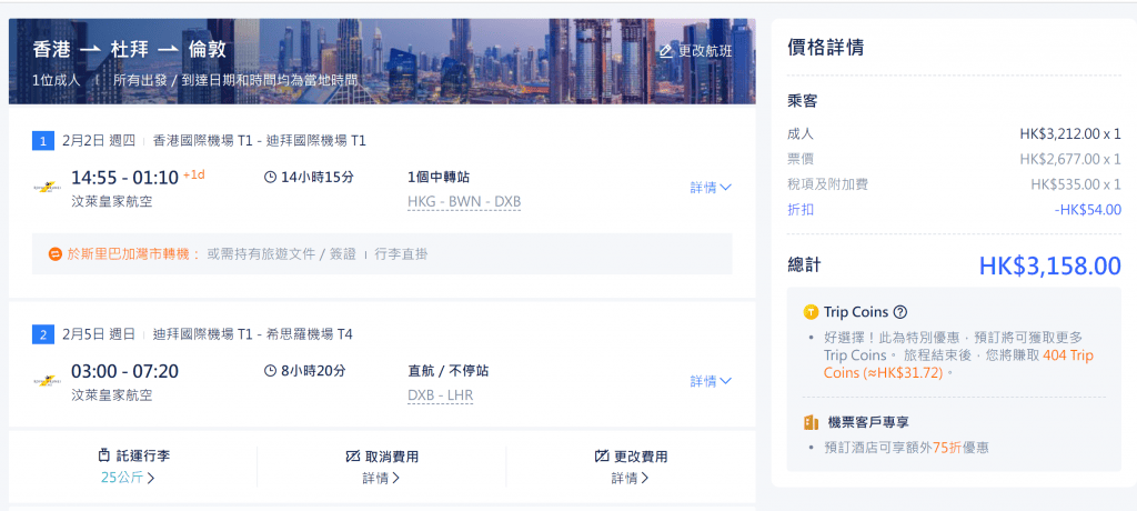 大家可以上Trip.com / 汶萊皇家航空官網訂購 (想stopover停留杜拜玩一玩,可以用Trip.com”多個目的地”功能去search