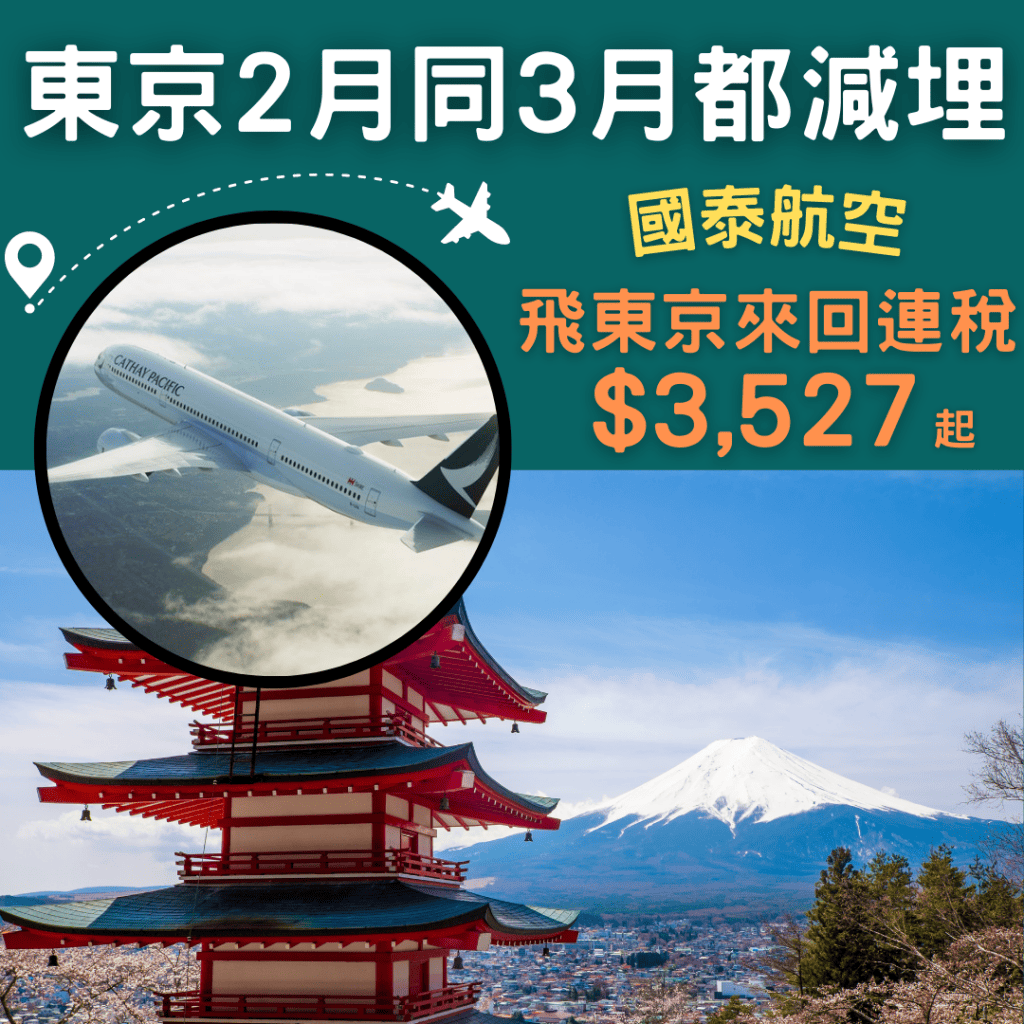 國泰飛東京!2月同3月都減埋啦!連稅三千五!香港飛東京二人同行來回連稅每人只需$3,527起 – 國泰航空 (優惠至12月5日)