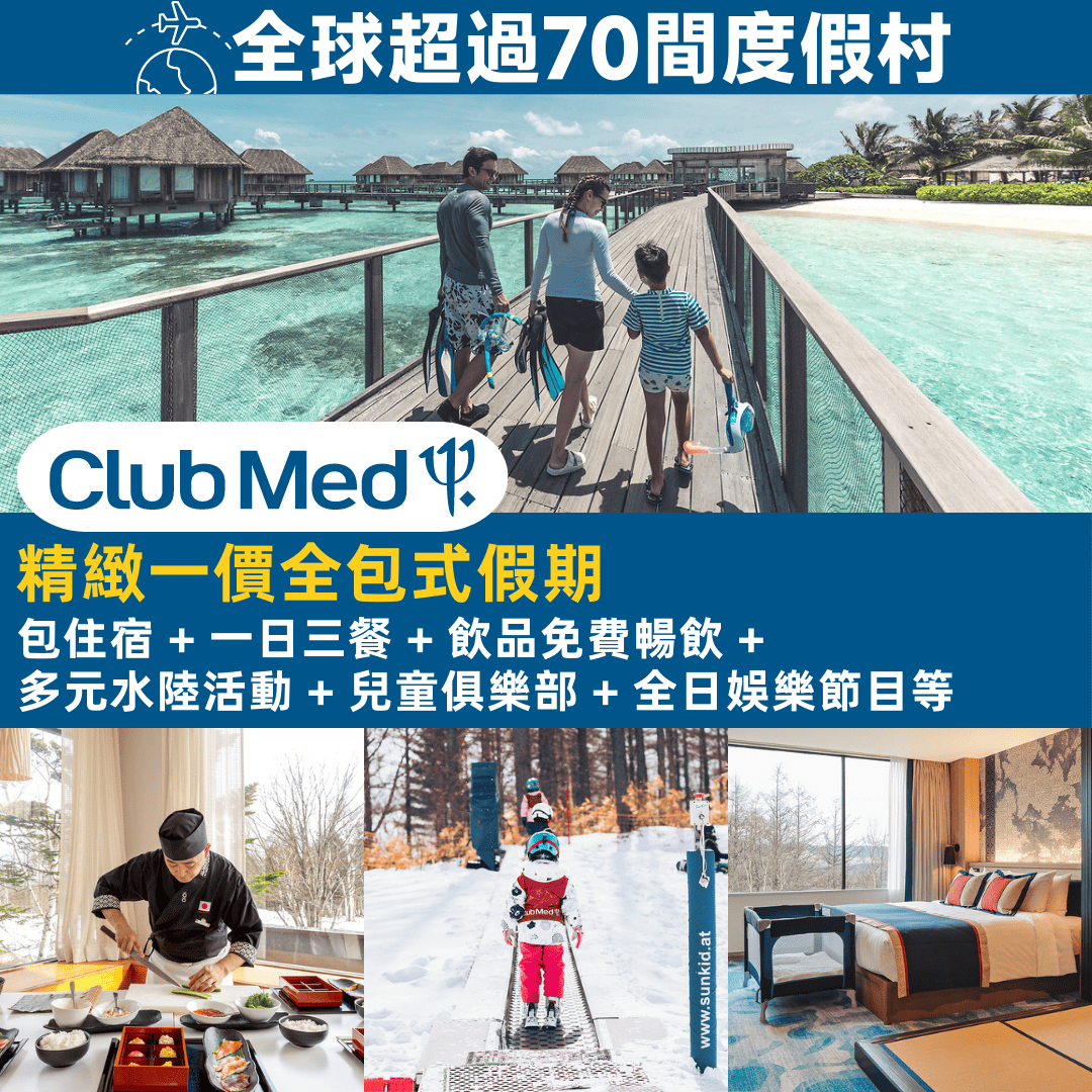 Club Med係全球有超過70間度假村遍布20多個國家!最受港人喜愛嘅日本、泰國、峇里島、馬爾代夫、法國都有!Club Med精緻一價全包式假期提供多種房型選擇,小朋友仲可享用兒童俱樂部服務添!一個價錢包晒住宿+一日三餐+飲品免費暢飲+一系列水上/雪地活動+陸上活動連團體課程+兒童俱樂部(兒童照護服務)、晚間娛樂活動等,完全唔駛怕悶,照顧一家大細唔同需要!無論你想去滑雪感受濃厚嘅冬日氣氛,定想遠離煩囂去歎陽光與海灘都無問題!Club Med絕對可以為你提供獨一無二嘅假期體驗!
