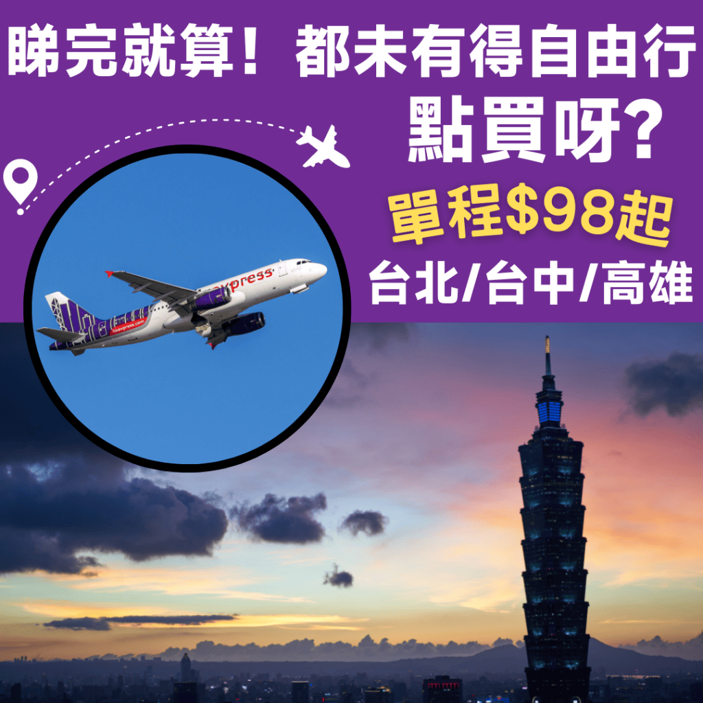 睇完就算!都未有得自由行,點買呀?限時48小時激減!香港飛台北/台中/高雄單程只需$98起 – HK Express (優惠至12月2日)