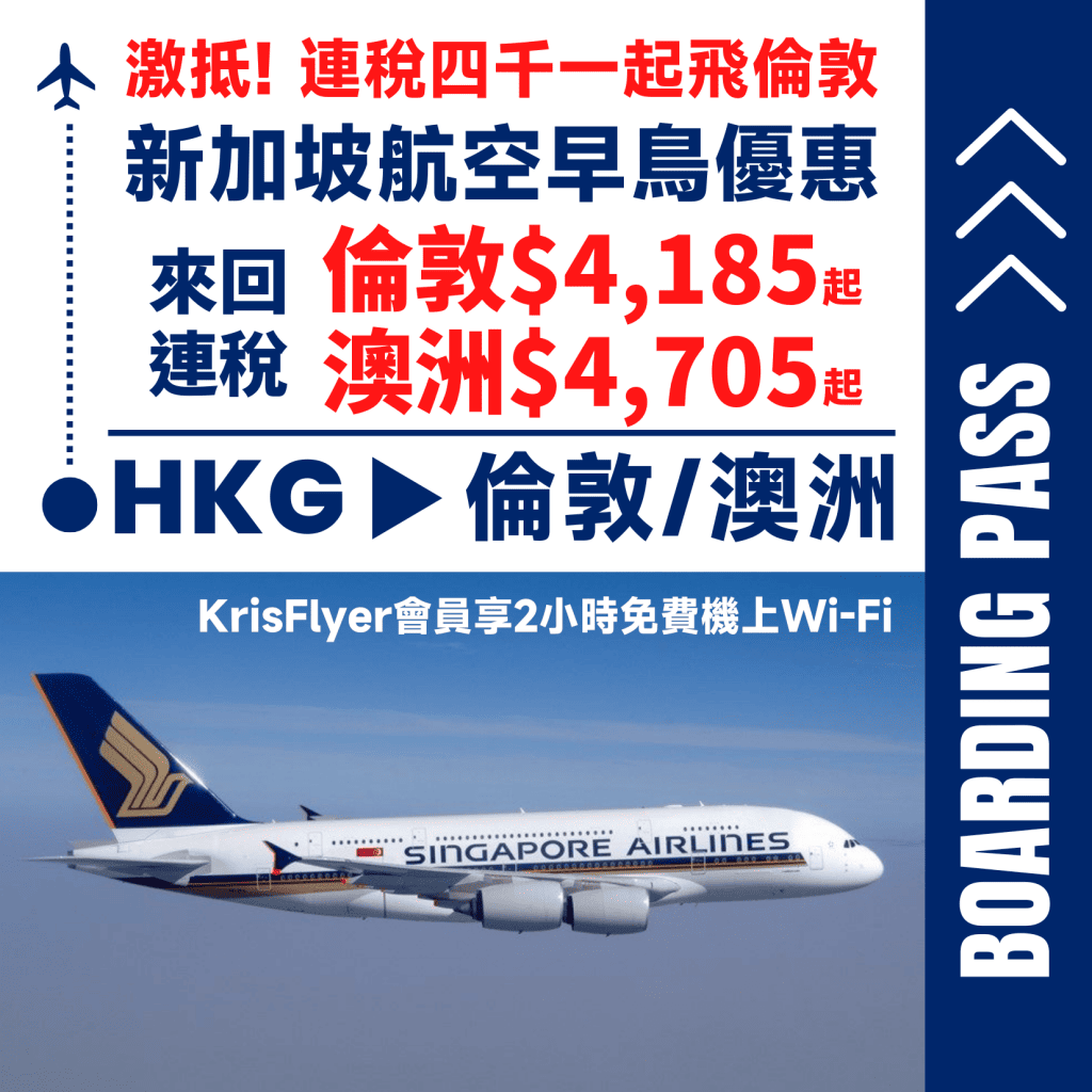 嘩嘩嘩!激抵!連稅四千一起飛倫敦!新加坡航空早鳥優惠!香港飛倫敦來回連稅只需$4,185起、澳洲$4,705起!KrisFlyer會員更可享2小時免費機上Wi-Fi (優惠至12月16日)