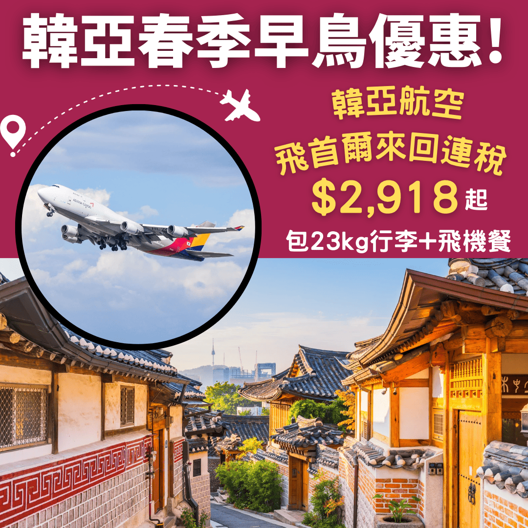 首爾連稅二千九!韓亞早鳥優惠!23kg行李!香港飛首爾來回連稅只需$2,918起 – 韓亞航空 (優惠至12月15日)