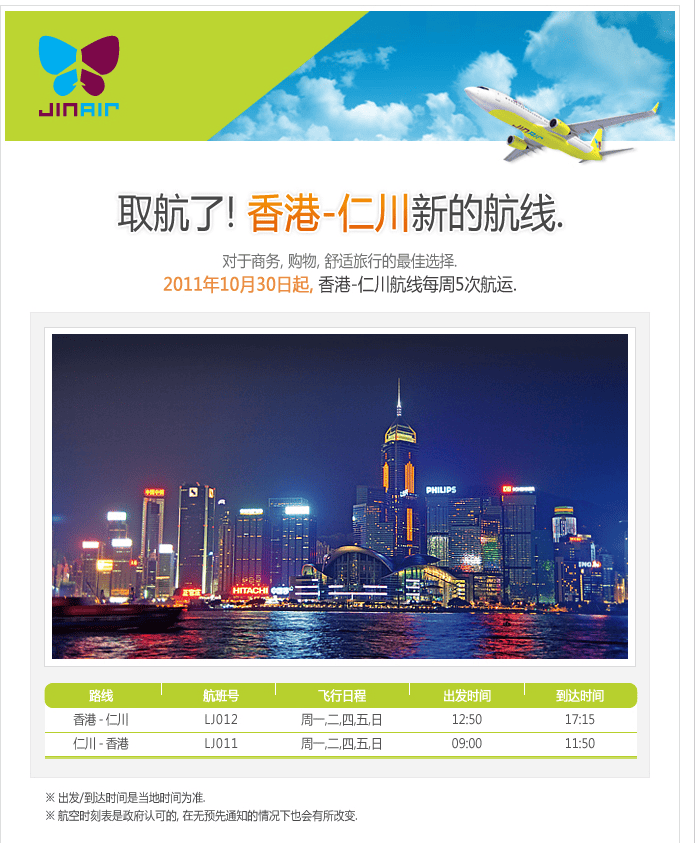 恒利旅運:http://www.pattersontravel.com.hk/newsletter/2011/Oct/Jin_Air_PTS_promotion.html