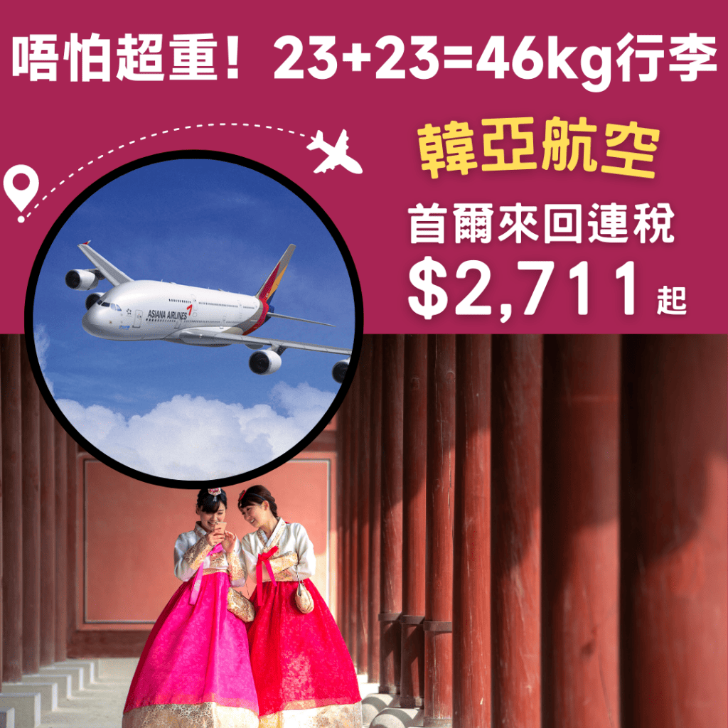 唔怕超重!韓亞送多一件行李!23kg+23kg=46kg行李!香港飛首爾來回連稅只需$2,711起 – 韓亞航空 (優惠至12月15日)