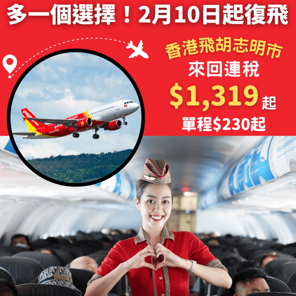 多一個選擇!平飛越南!2月10日起復飛!香港飛胡志明市單程$230起,來回連稅$1,319起 – 越捷航空 Vietjet Air