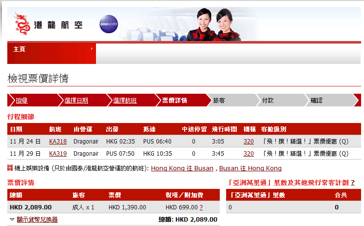我們以韓國釜山為例,機票$1,390 + 稅$699 = 機票連稅為$2,089