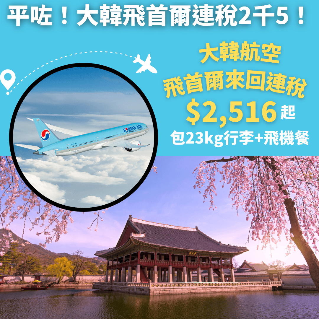 又平咗!大韓連稅2千5飛首爾!可凌晨機去晩機返!6月30日前出發!香港飛首爾來回連稅只需$2,516起 – 大韓航空 (優惠至2月28日)