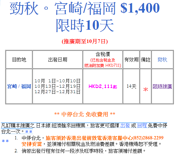 宮崎暫時所見得10月16日去10月30日返,11月9日去11月20日返有連稅$2,111平飛,不過都係得2-3張平飛而已