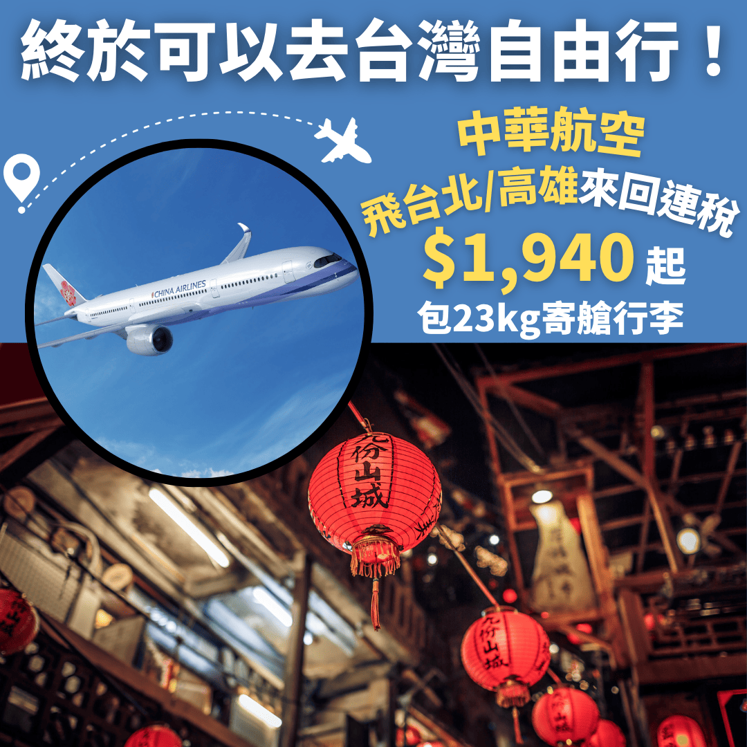 終於可以去台灣自由行!華航連稅千九!可以Open Jaw!香港飛台北、高雄來回連稅$1,940起 – 中華航空 (優惠至2月22日)