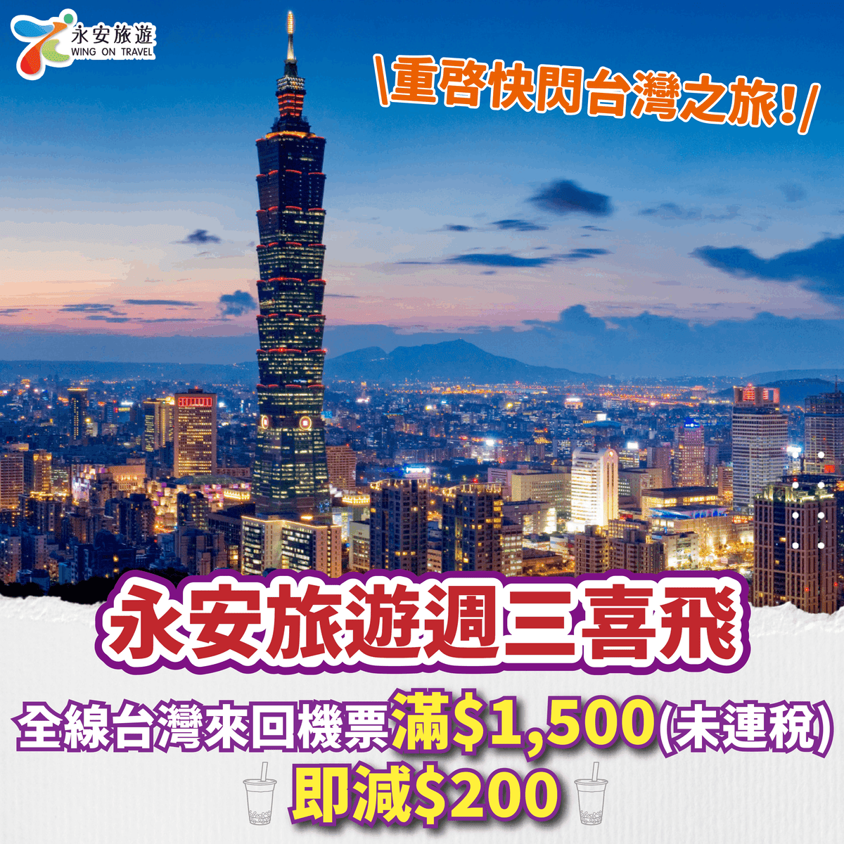 【永安旅遊 週三喜飛 – 台灣機票勁減$200】重啓快閃台灣之旅!全線台灣來回機票滿$1,500即減$200!台北來回連稅:國泰$1,743起、華航$1,839起、長榮$1,878起