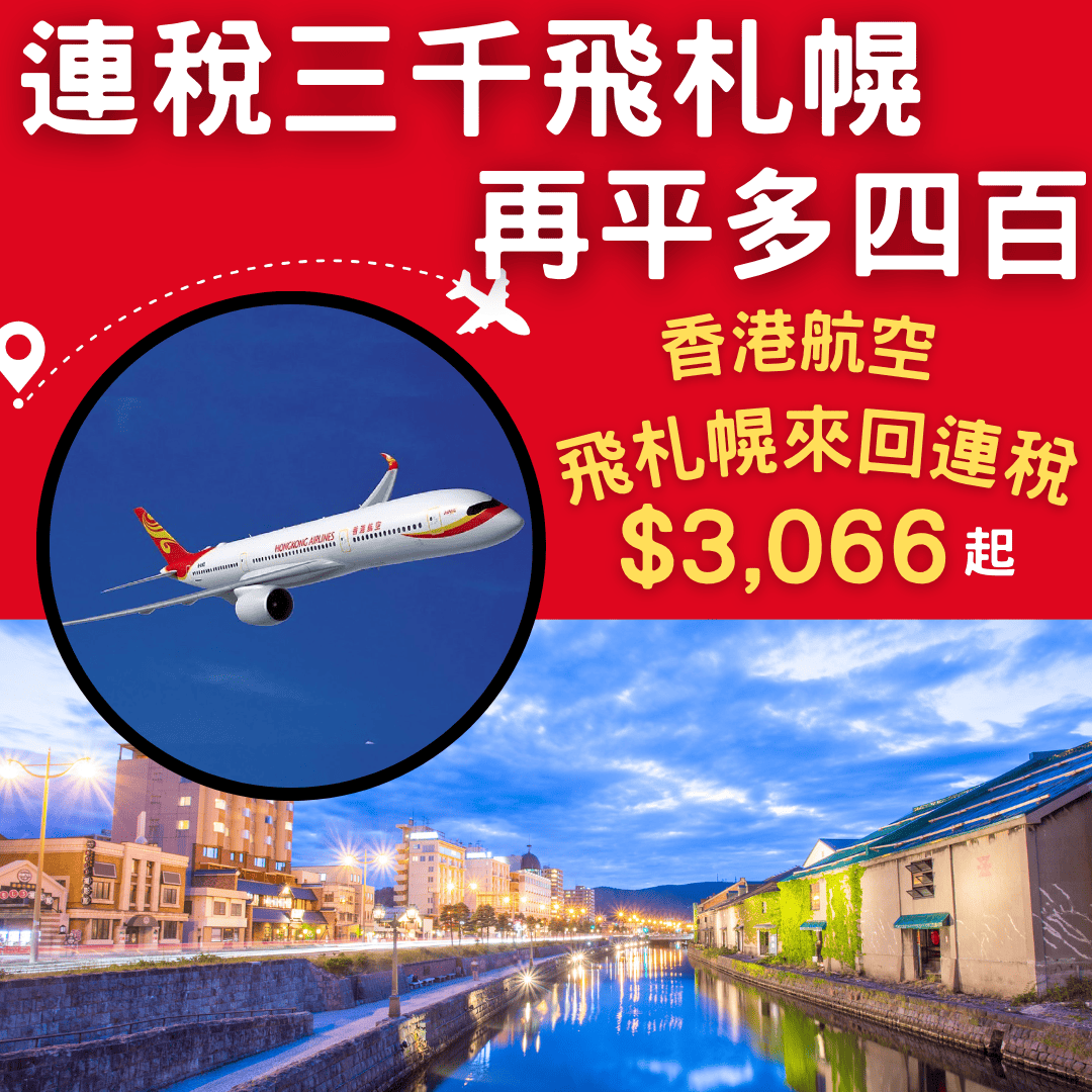 抵呀!連稅三千飛札幌!再平多四百!香港飛北海道札幌來回連稅只需$3,066起 – 香港航空 (優惠至3月31日)