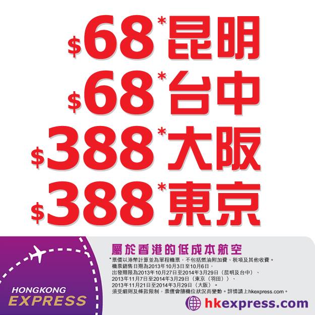 快搶!勁抵!香港往返台中只需$90、大阪$710、東京$730 – HK Express 香港快運 (優惠至10月6日)