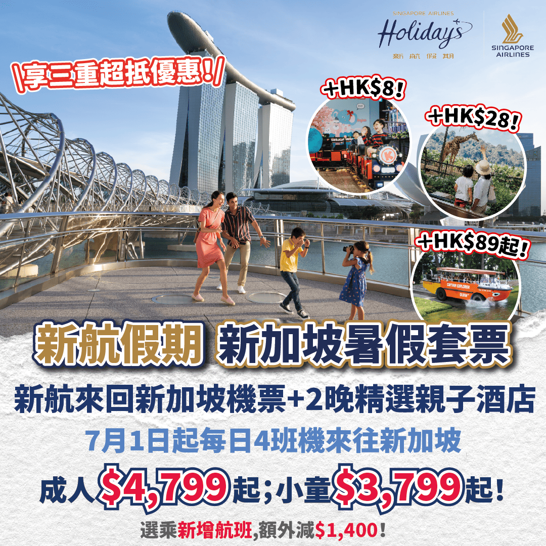 暑假童遊新加坡!享限定三重超抵優惠!新加坡航空來回機票連2晚精選親子酒店,成人每位$4,799起;小童$3,799起!選乘新增航班再減高達$1,400!仲有免費機上WiFi同埋新加坡行程體驗!