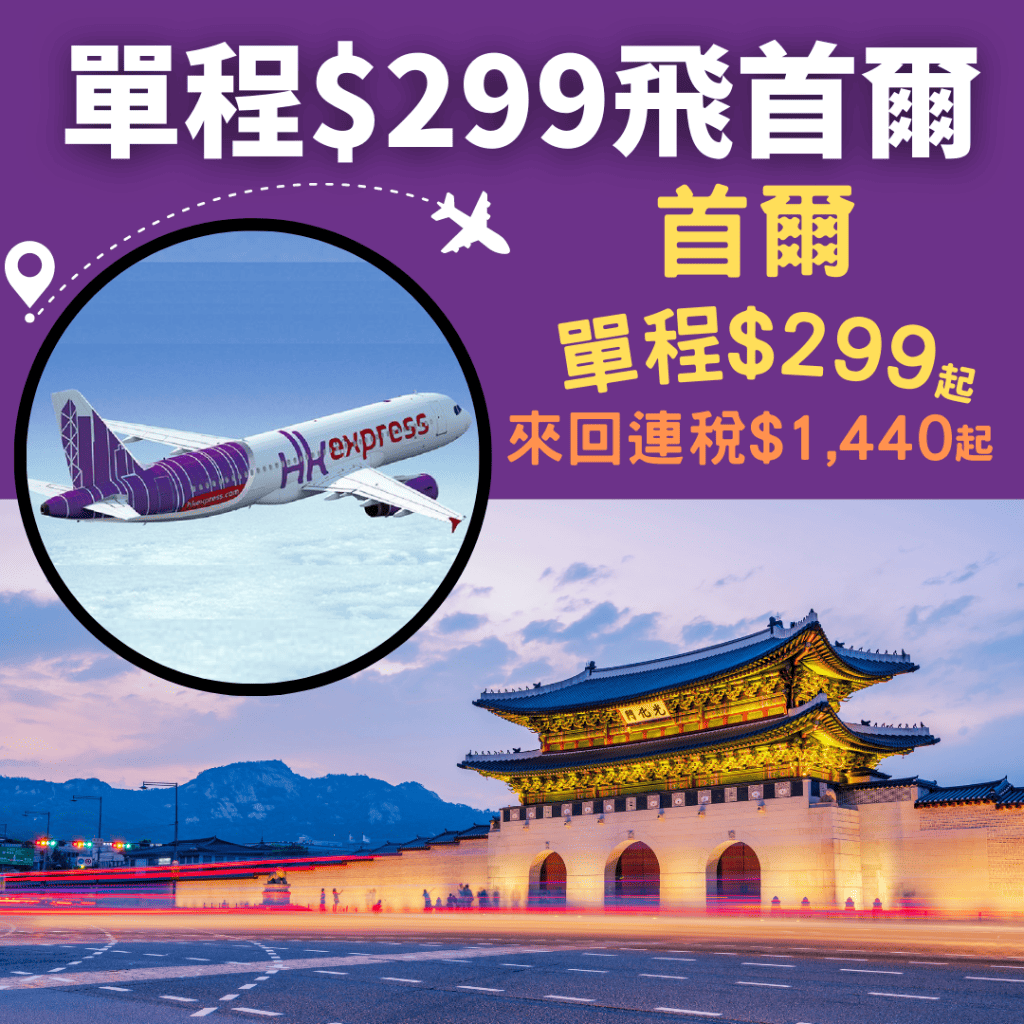 香港飛首爾單程只需$299起,來回連稅$1,440起