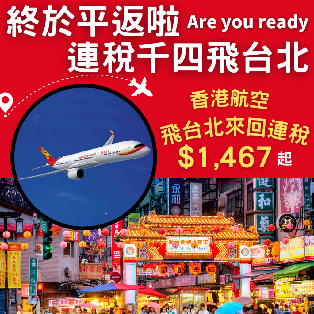 嘩!連稅千四飛台北!有早機去晚機返!香港飛台北來回連稅只需$1,467起 – 香港航空 (優惠至4月30日)