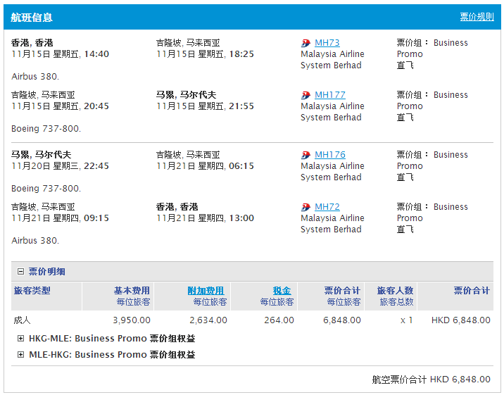 記住呢個價係坐Business Class,當中香港飛吉隆坡個程來回可以揀坐A380商務艙! (去程MH73 ,回程MH72)