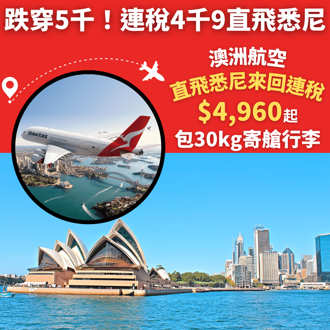 平呀!跌穿5千!連稅4千9直飛悉尼!限時優惠!香港直飛悉尼來回連稅只需$4,960起 – 澳洲航空 (優惠至4月21日)