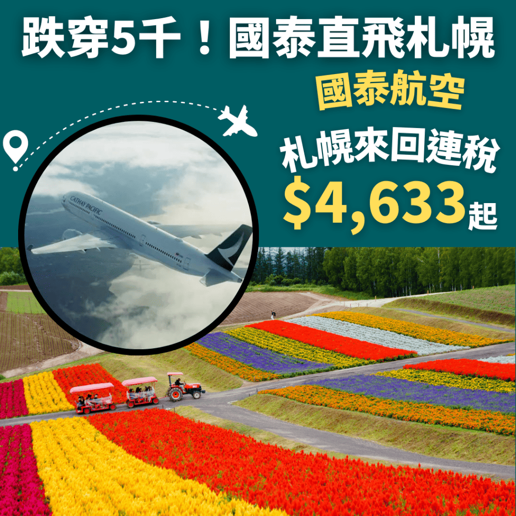 跌穿5千!連稅4千6!國泰直飛札幌!香港飛札幌來回連稅$4,633起 – 國泰航空 (優惠至5月31日)